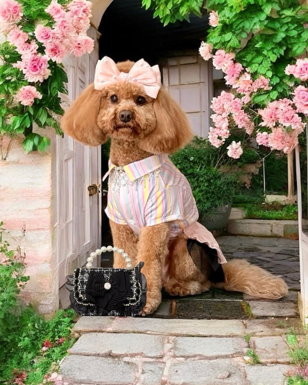 The Blush Belle Bow is the ultimate in sweet sophistication. Styled in a soft pink satin and dotted with delicate pearls and sparkles, this oversized bow is made for the pup who loves a little extra flair. Whether it’s a birthday, brunch, or a casual strut down the street, this bow adds a dash of darling to every moment. Attaches with a metal alligator clip.