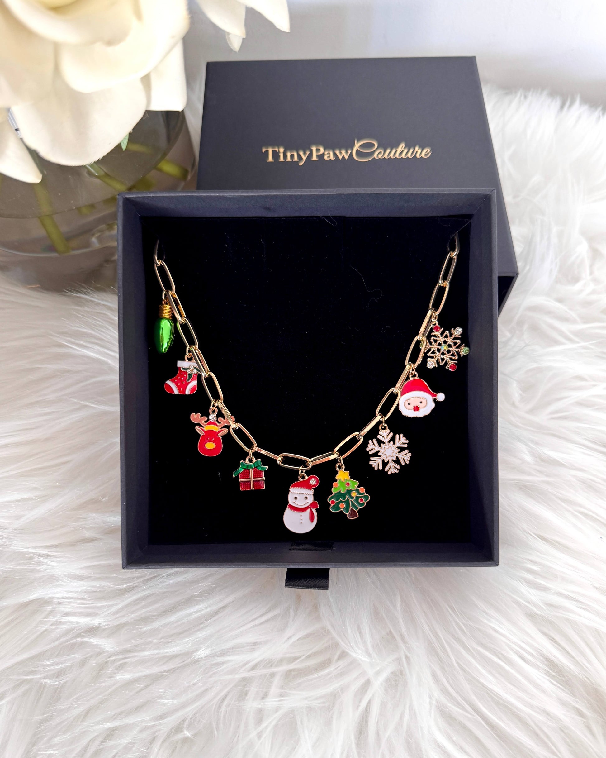Each charm is brightly colored and beautifully detailed, adding a playful yet luxurious touch. Presented in a premium TinyPawCouture gift box, this necklace makes the perfect holiday statement piece for pets who love to dress up in style.
