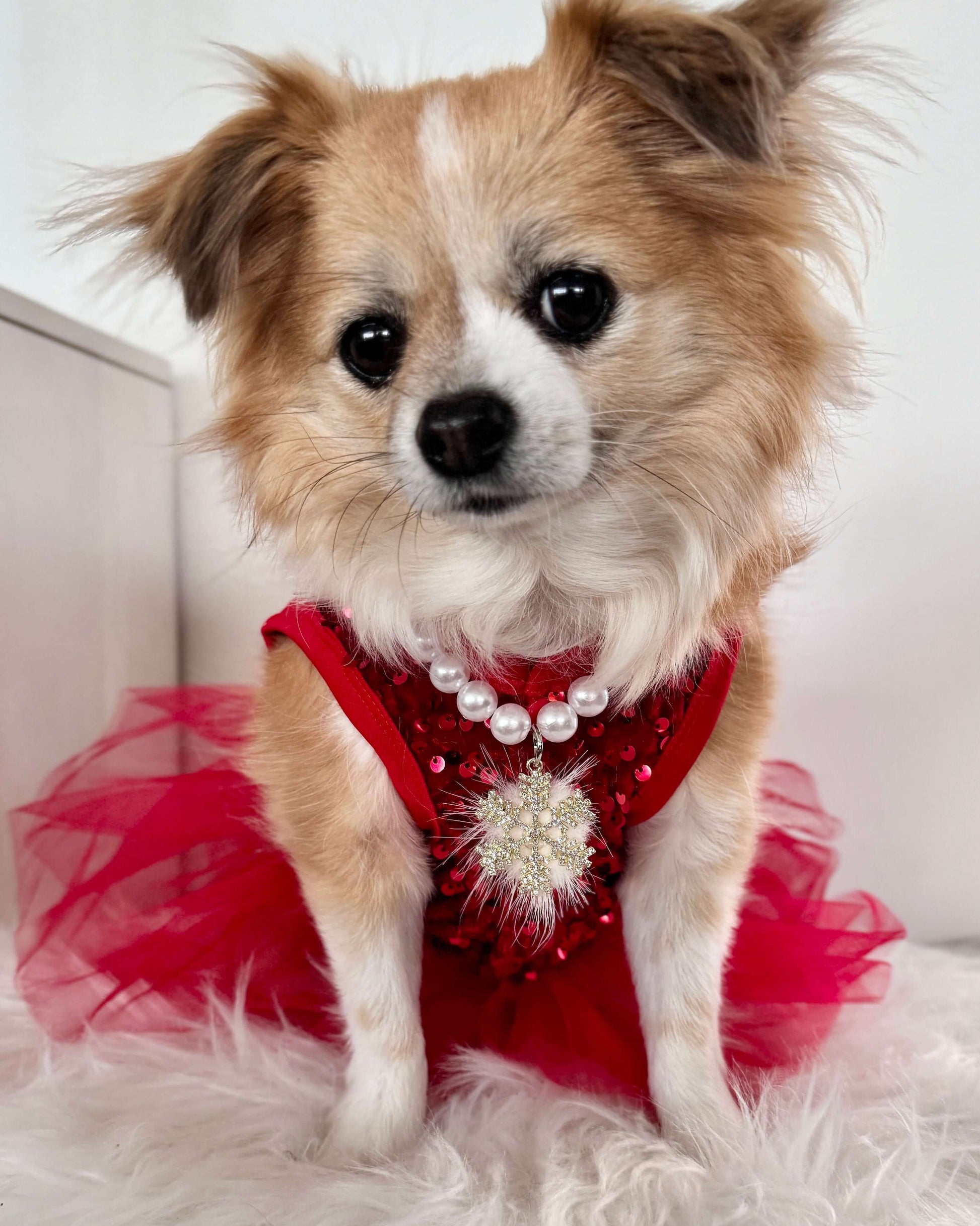 Our Models: Ollie (Green Dress) 3.8kg and Charlie (Red Dress) 4.5kg are both wearing a size XS. They have thick long hair which effects where the necklace sits so they were it looser then short hair pups would. The necklace is loose so it sits lower, overhanging the dress to allow it to stand out more.