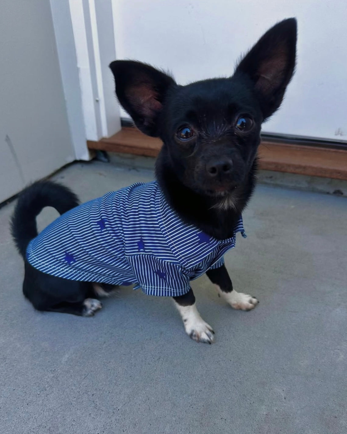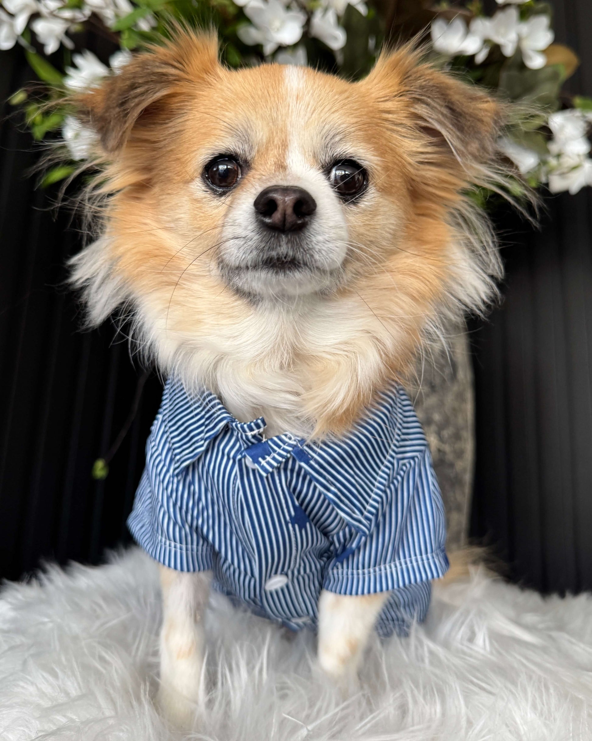 Tailored from soft, stretchy, and feather-light fabric, it provides exceptional comfort without compromising refinement. The deep navy and white pinstripes, punctuated by subtle blue stars, evoke quiet sophistication with a dash of personality. Finished with a smart collar, it’s the ideal attire for leisurely garden strolls, evening gatherings, or any occasion that calls for understated elegance.