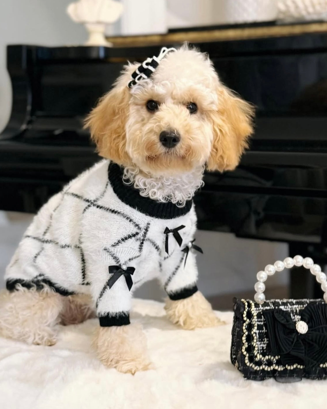 This luxurious cardigan is a testament to elegance and comfort, crafted with meticulous attention to detail. Made from the finest materials, its pristine white fabric serves as the canvas for a delicate black pattern, adding a touch of sophistication to its timeless design. Adorning the cardigan are dainty black bows, strategically placed to accentuate its graceful silhouette.