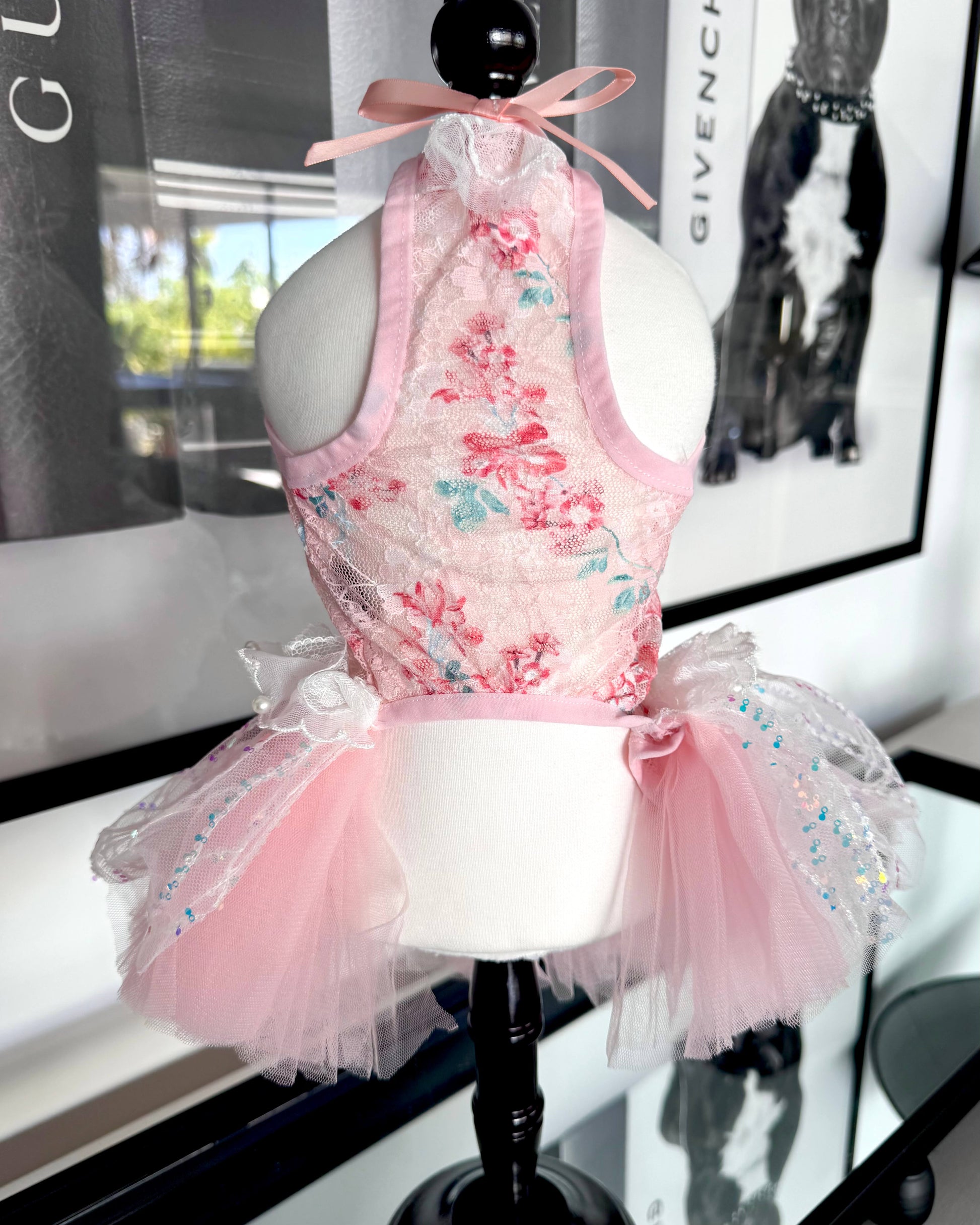 A beautifully feminine tutu dress crafted in soft blush tones and delicate floral stretchy lace. The bodice features a romantic blossom print, finished with gentle ruffle detailing for an elegant silhouette. A dainty satin ribbon and lace waist accent adds a sweet finishing touch.