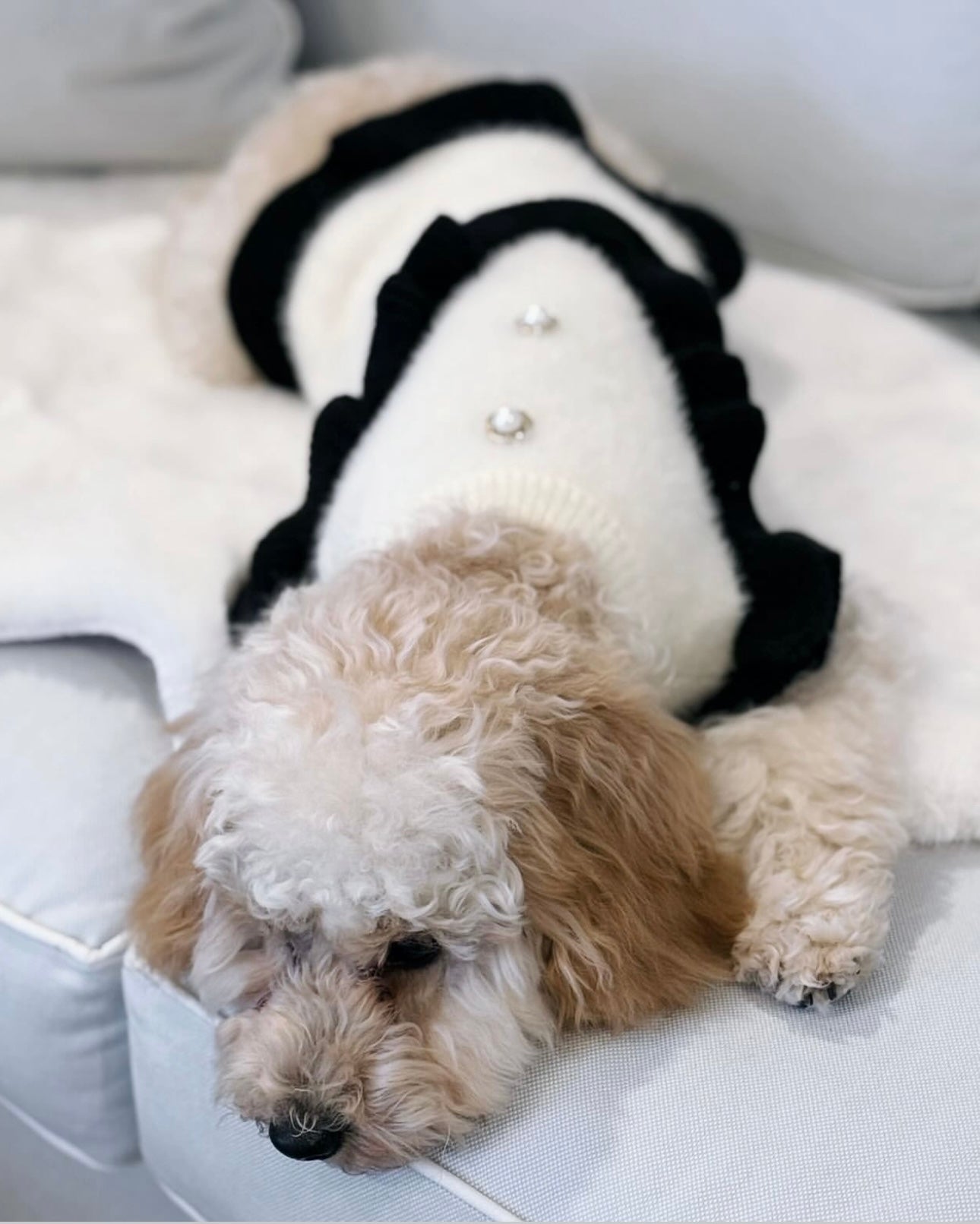 Give your pup a touch of timeless elegance with the Carmella Cardigan. This luxurious cream and black knit is made from a soft, premium fabric that feels as good as it looks. Featuring statement ruffle trim and gold pearl buttons, it’s the ultimate outfit for dogs with a flair for fashion.