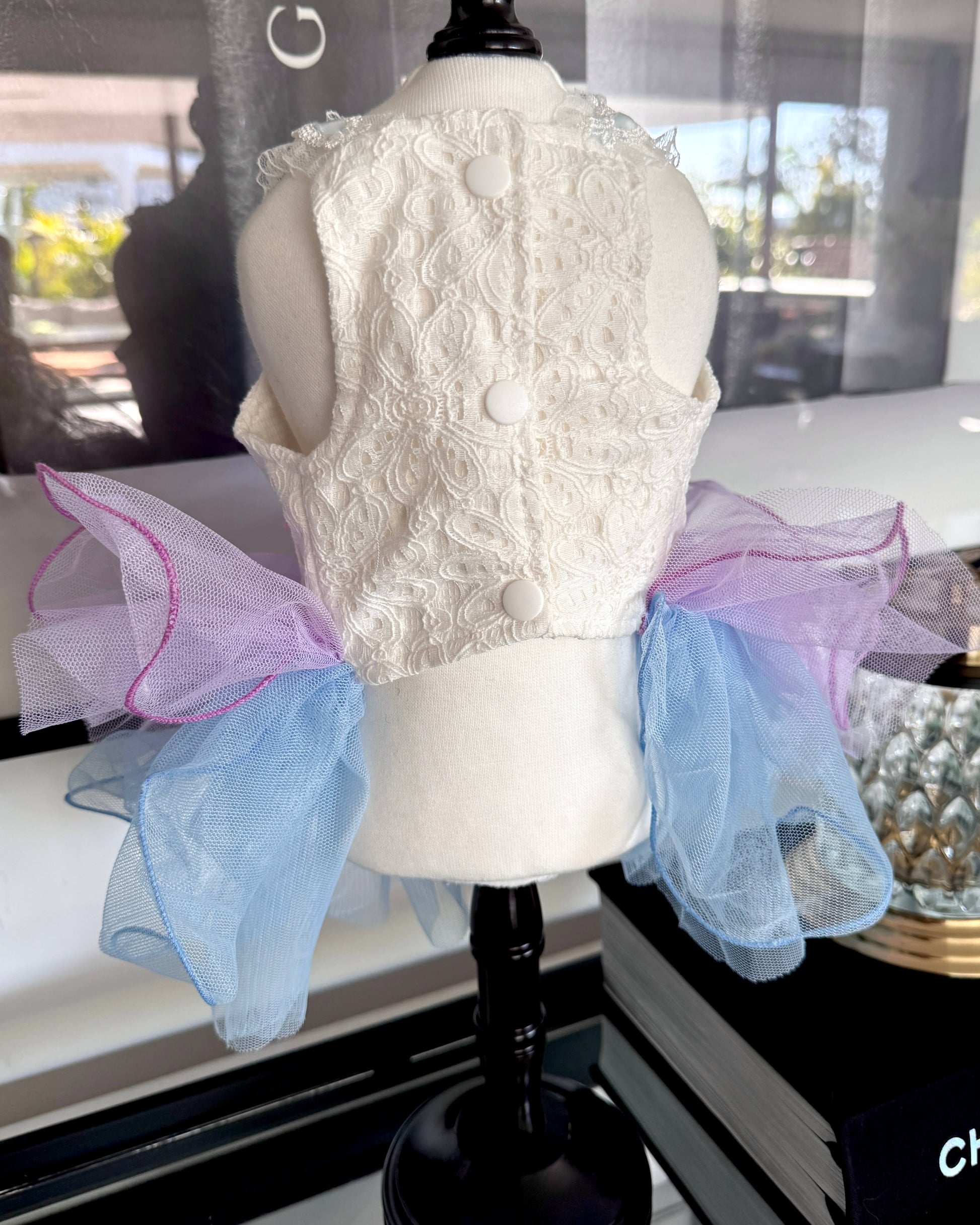 Featuring a delicate ivory lace bodice adorned with soft pastel blue ribbon lacing, this design captures timeless romance. The voluminous layered tulle skirt in shades of lilac and periwinkle is finished with a blush pink satin bow and crystal embellishment, creating a whimsical yet refined look.